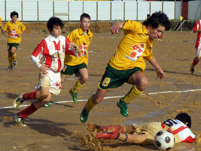 Foi no estado que a imagem documenta, captada poucos minutos antes do inicio do jogo em que a nossa equipa de Iniciados B, teve que defrontar a formação do Montijo, bem mais fortes fisicamente.